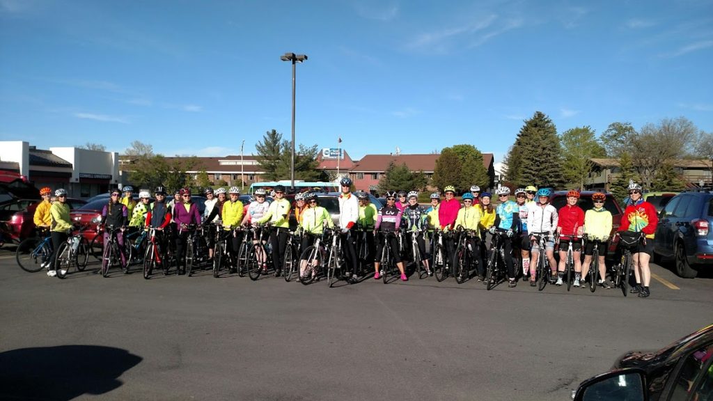 The Women’s Road Ride (WRR) is a club-sanctioned road ride for women that happens each Wednesday night, spring, summer and fall. We like to call ourselves the “Gorges Gals”! They are a great place for women to cycle together, get a good workout, and build lasting friendships on the bike. These rides convene in the East Hill Plaza parking lot behind the Tompkins Community Bank at 6pm and break out into 3 groups, A, B or C. The A ride is the fastest (typically averaging 15+ mph) and has the most elevation. The B ride is moderately paced (13-15 mph avg) with a moderate amount of climbing, and the C ride is slower paced (10-12mph avg), with shorter distances with less climbing.
